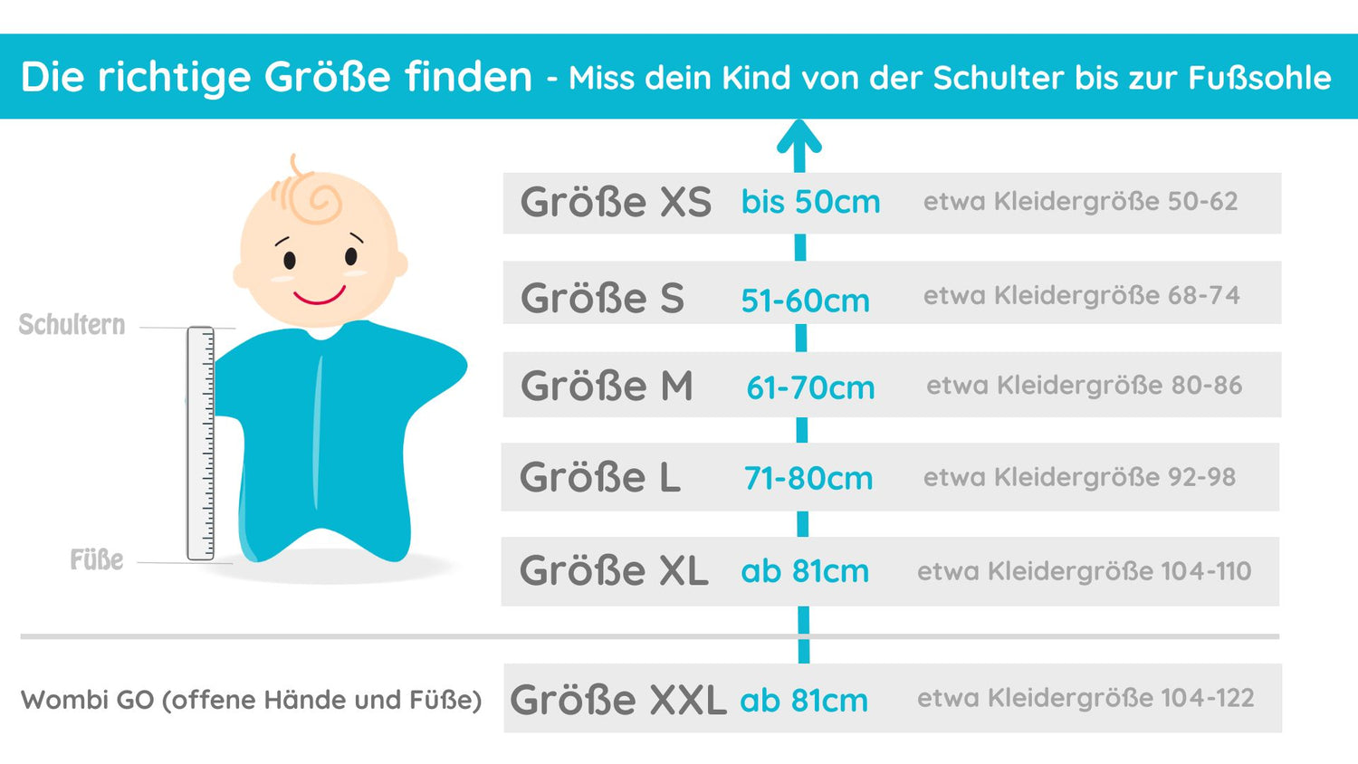 Größe XXL (Wombi Go mit offenen Füßen): ab 81cm - etwa Kleidergröße 104-122